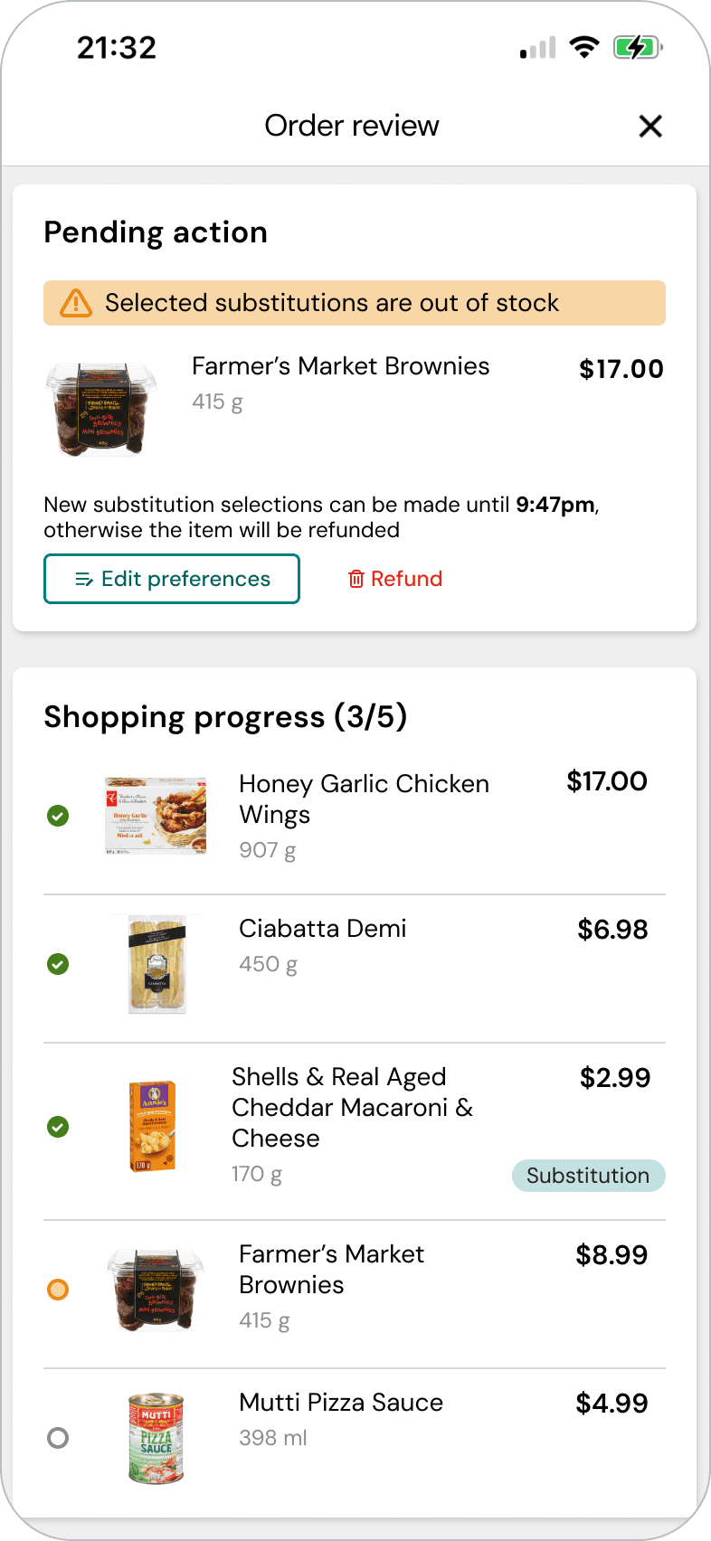 Each item includes a substitution preference, guideing the system and helps staff make decisions to ensure customers receive items in the way they prefer.