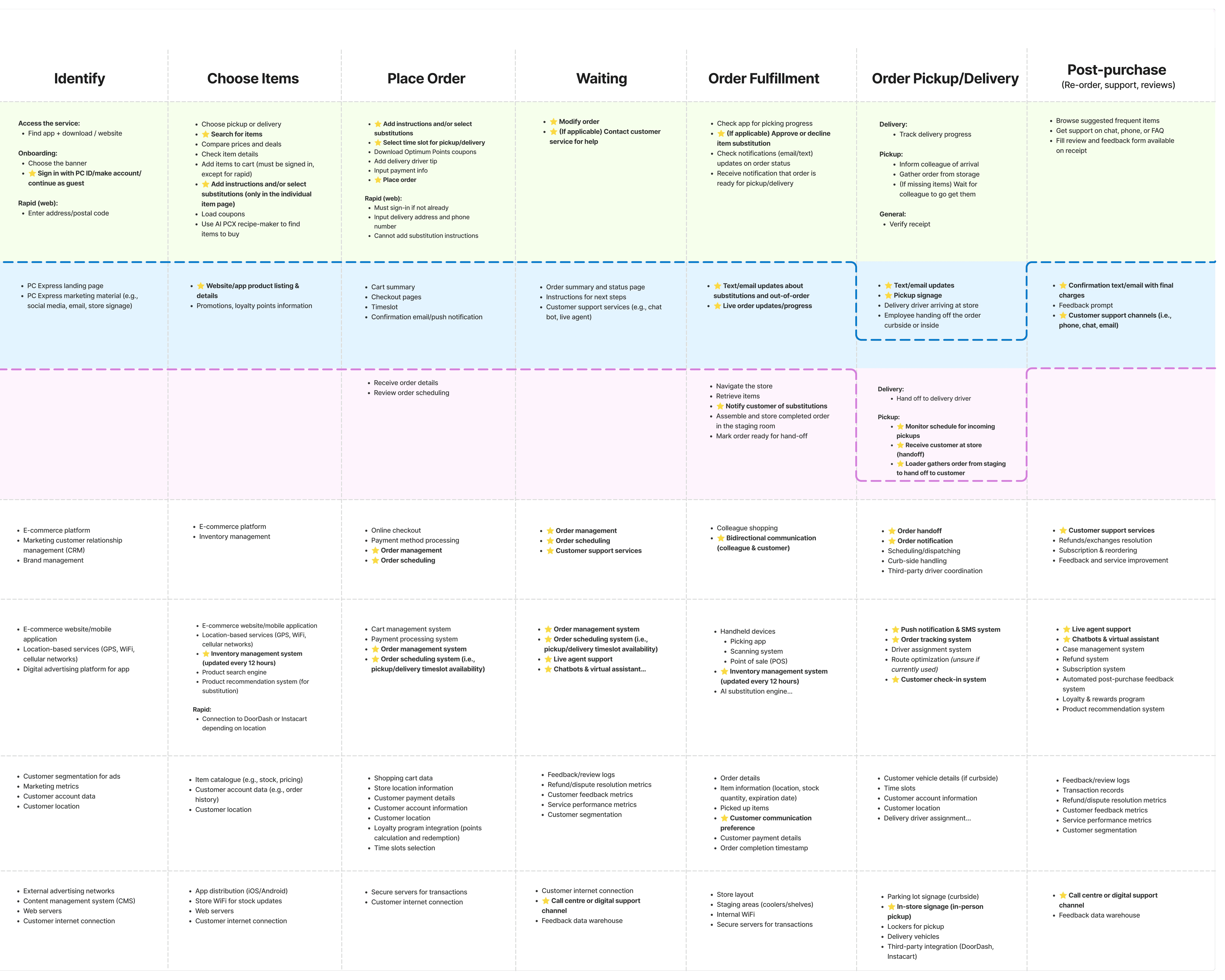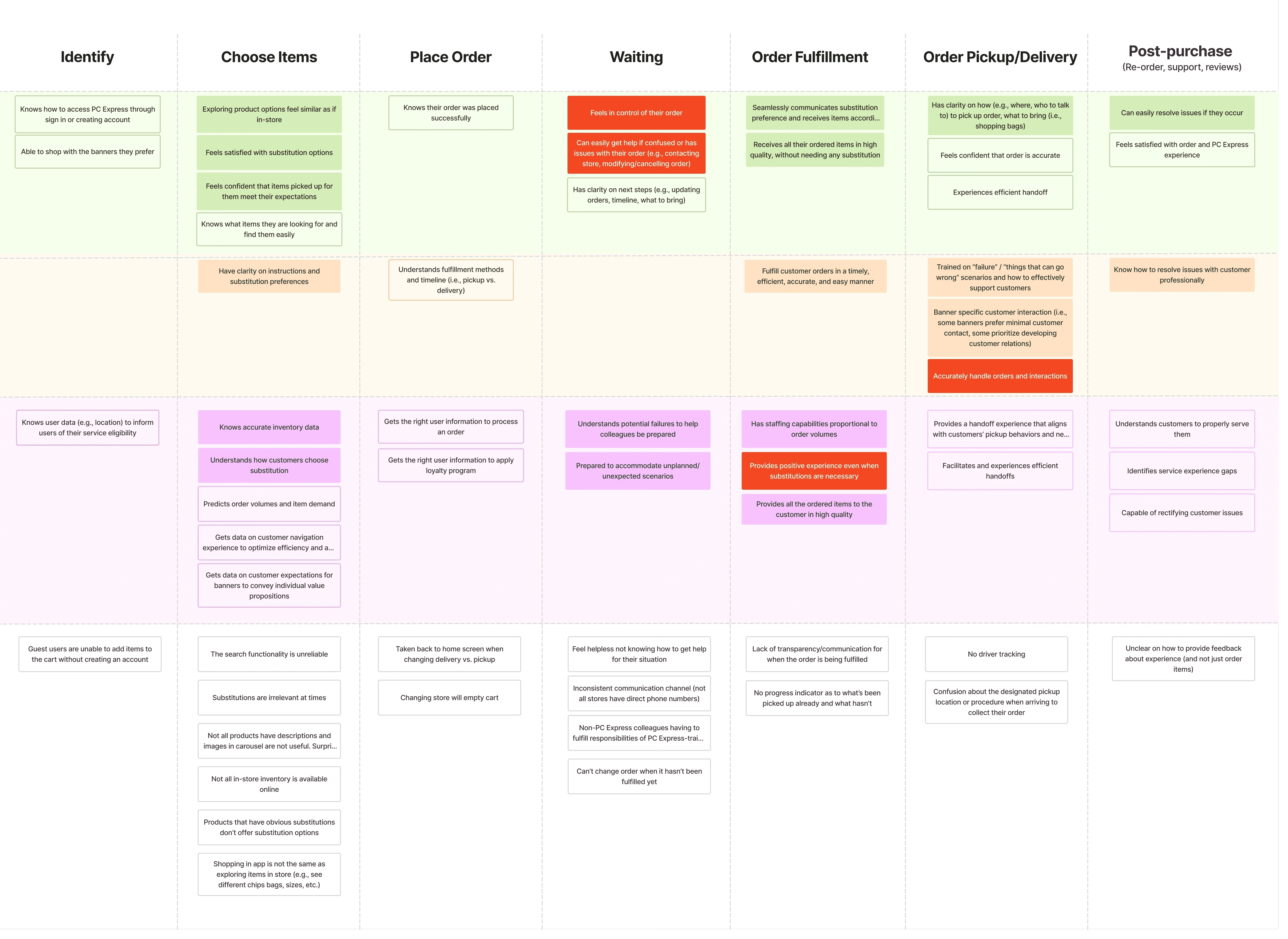 PC Express relies on coordination between digital ordering and in-store fulfillment. When these layers fall out of sync, customers lose the control they normally have in-store (e.g., handling substitutions), while staff deal with fragmented communication during fulfillment.