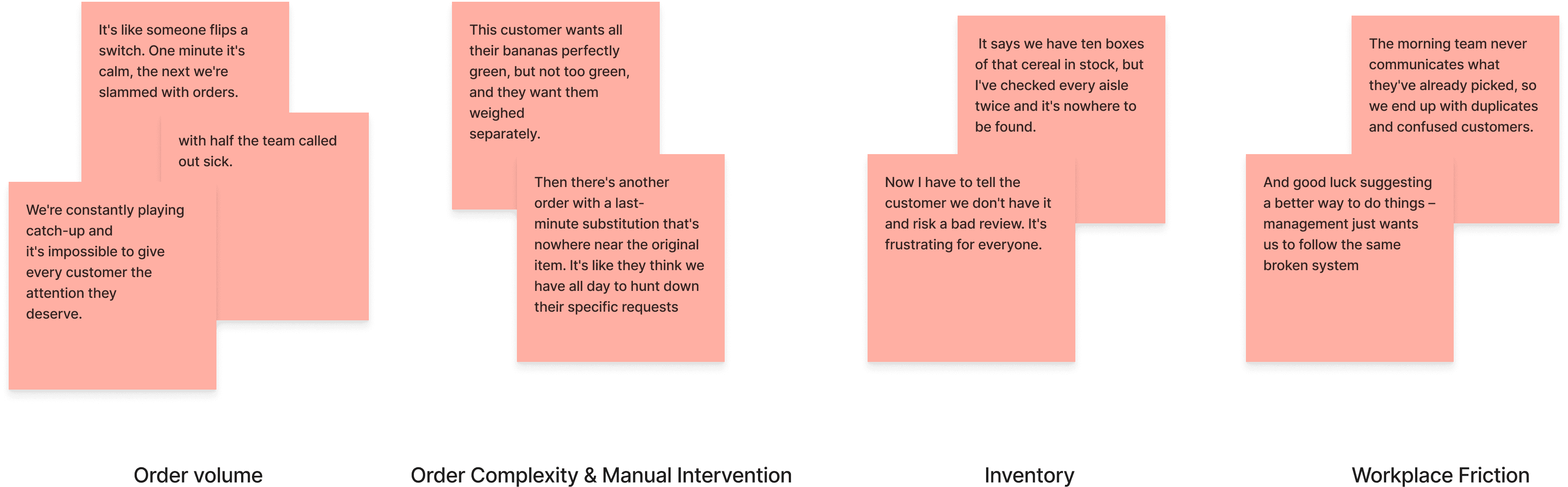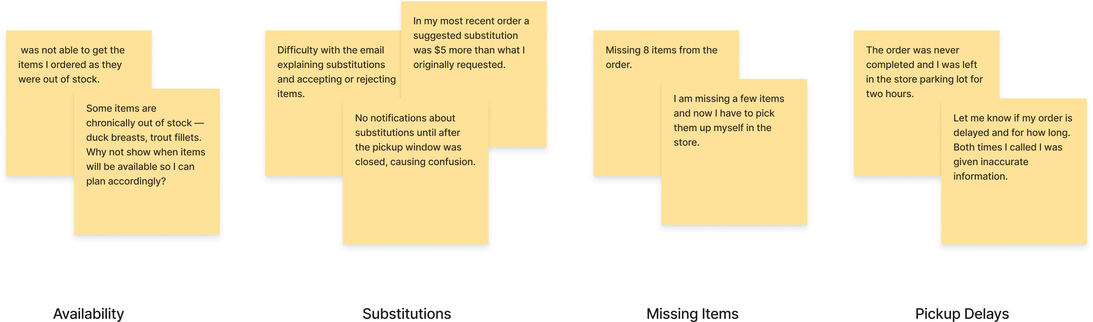 Similar issues show up across the journey, from login and inventory mismatches to checkout failures and pickup confusion.
